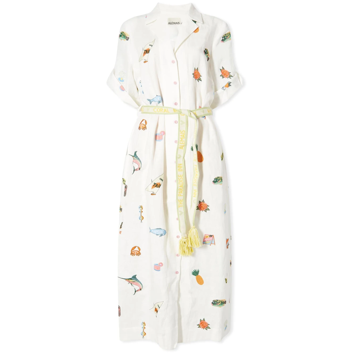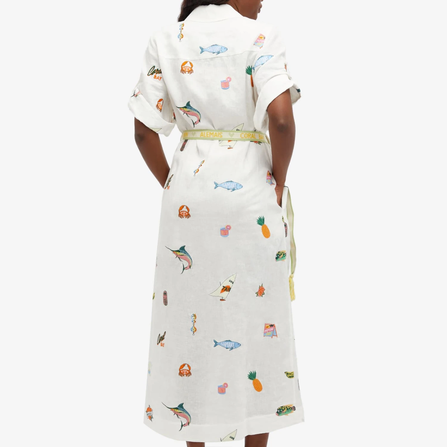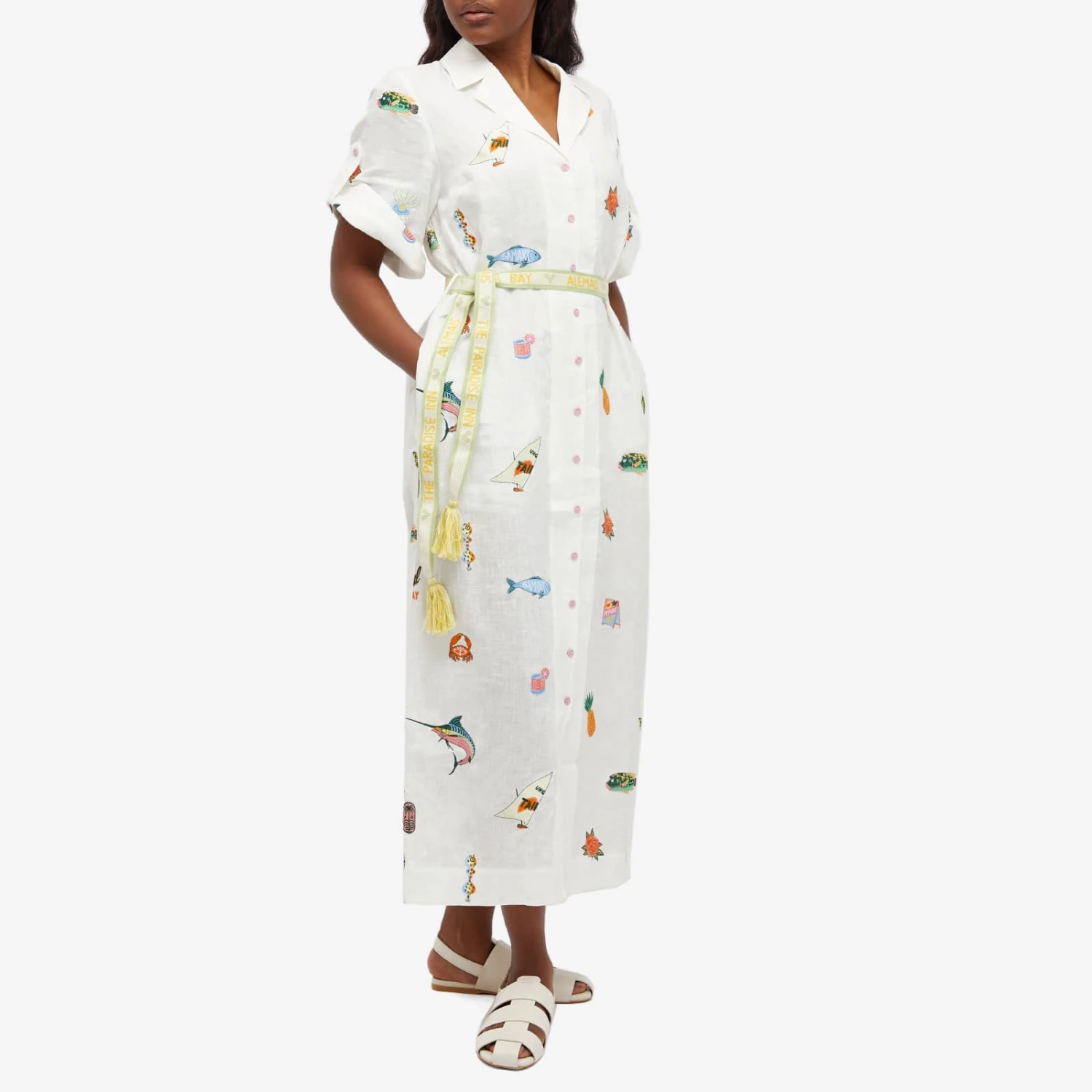 Escape to warmer weather and dreamy sceneries with the Blue Marlin Embroidered Dress by ALÉMAIS. Crafted with a breezy linen material that’s sprinkled with vibrant motifs of paradise from artist Alan Berry Rhys, this dress screams summer relaxation. Featuring a relaxed open collar design, you can tweak the sleeves and belt to your liking.