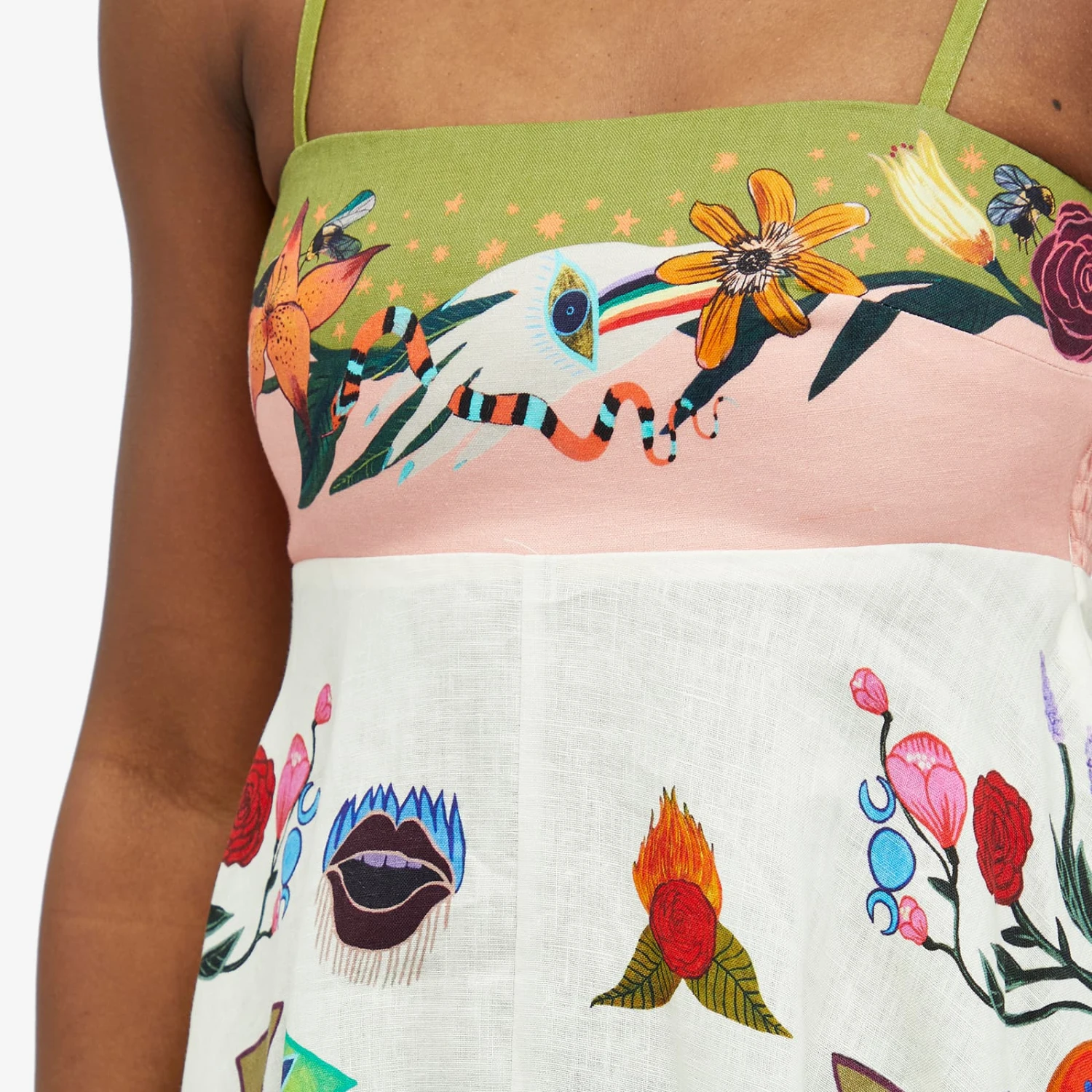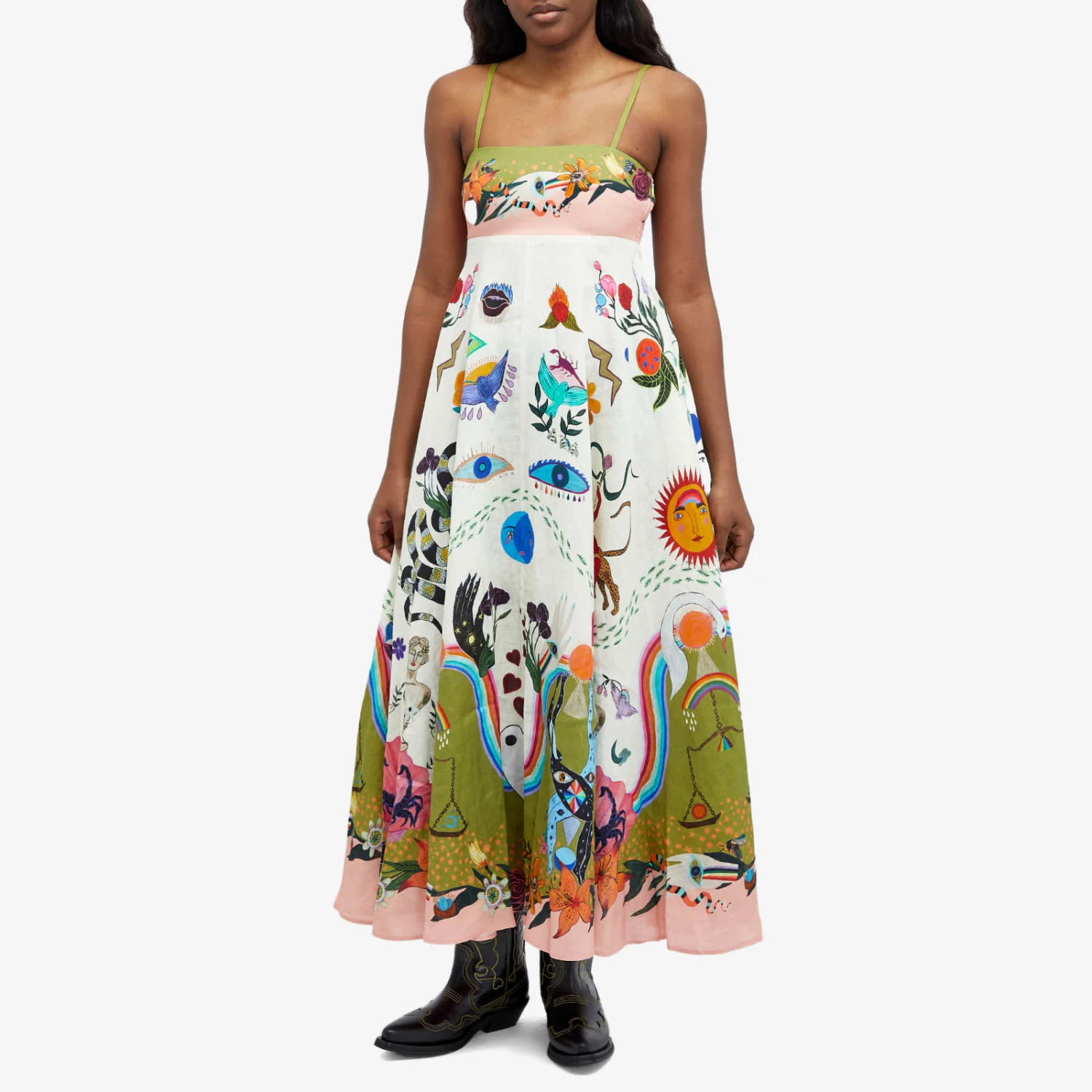 Transport into ALÉMAIS’ world with the Evergreen sundress, designed in collaboration with Meagan Boyd, American multidisciplinary artist. Weaving in Boyd’s love for astrology and personal mythologies, the Evergreen Sundress makes the perfect pairing for a sunshine-filled picnic. Designed using low environmental impact linen, its bold print and versatile shaping makes the perfect occasion or daily staple alike.