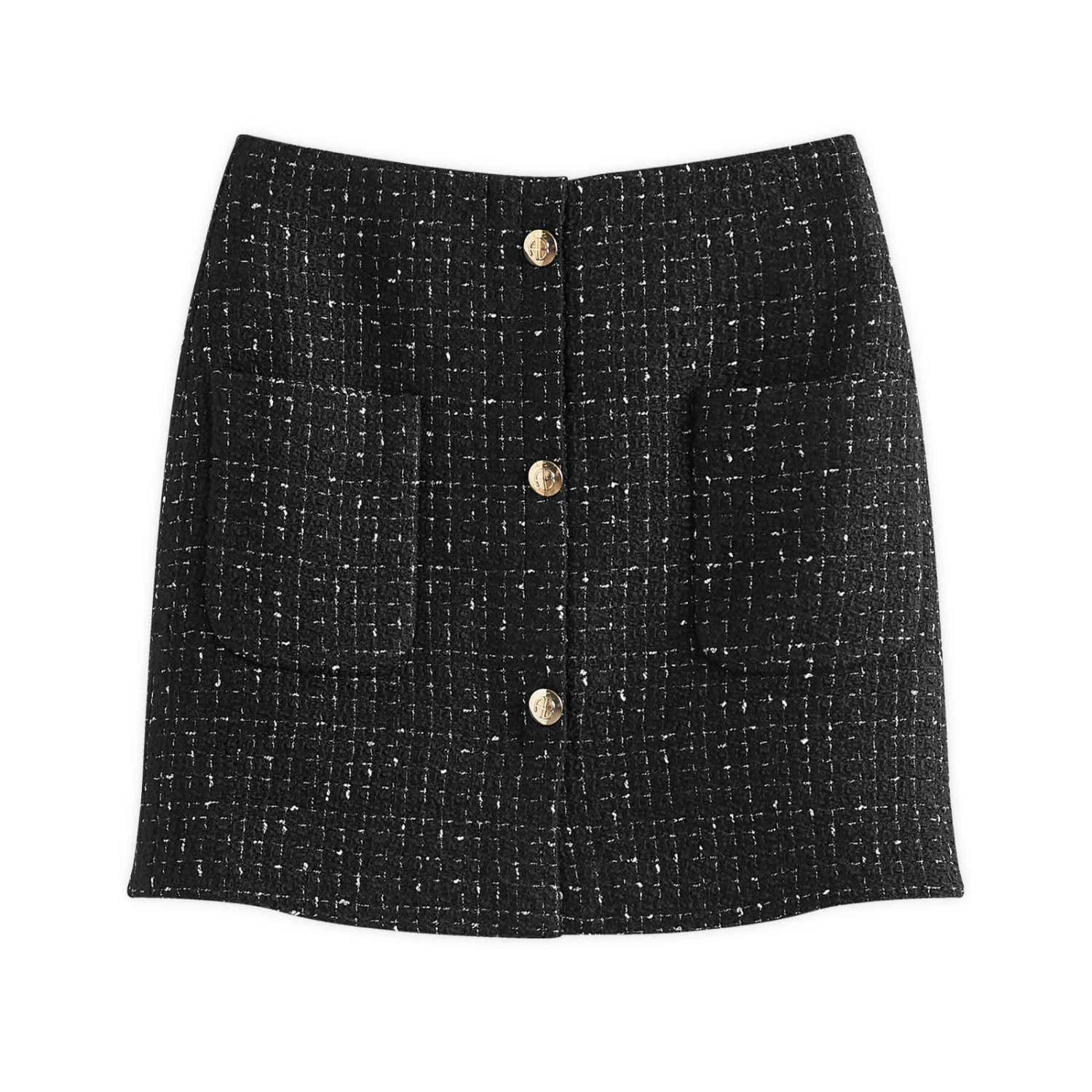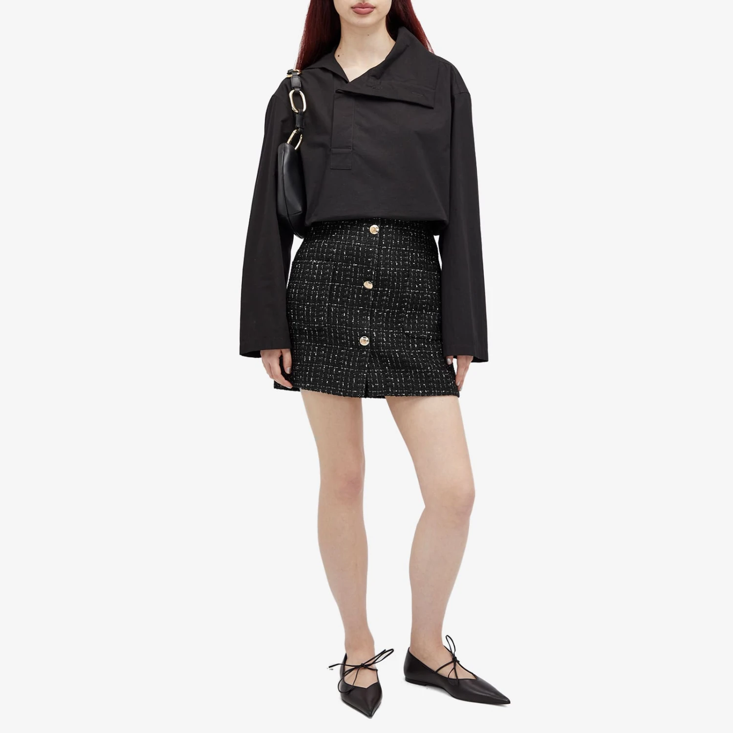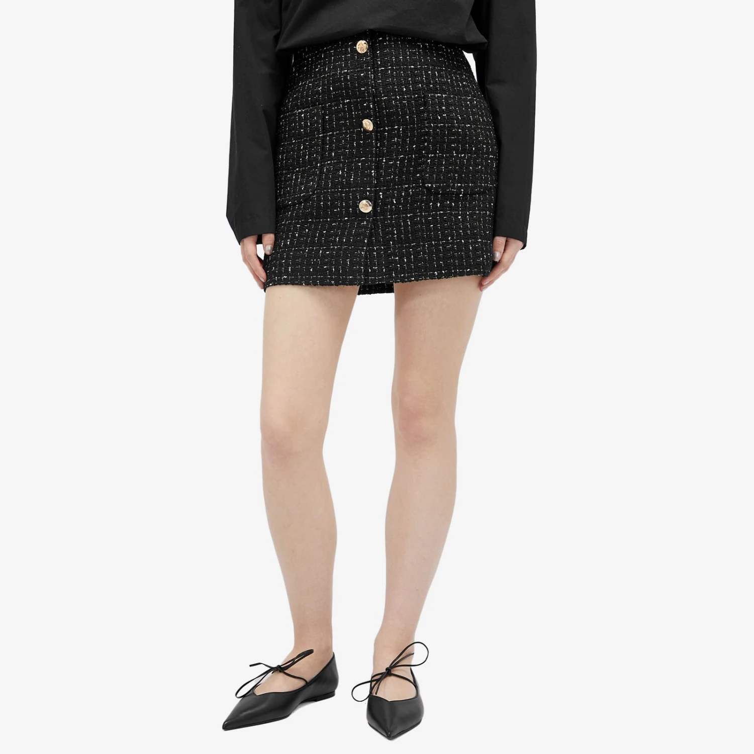 The Anine Bing Mateo Skirt draws inspiration from the Jackie O era of fashion with its all over tweed fabric. Cut to an A-Line design, its gold embossed buttons is styled in tandem with a metallic thread that runs throughout. Perfect for pairing with chunky loafers and ankle socks, it brings a new age to tweed.