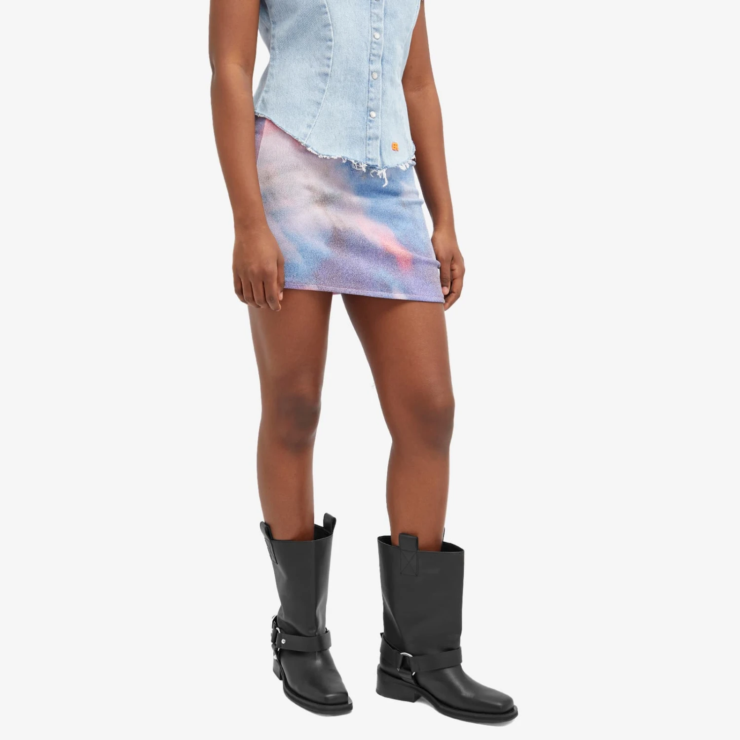 The Pre SS24 collection from Fiorucci feels like a sweet, handwritten note to the iconic brand, awash in dreamy pastel shades. The Flower Blur Mini Skirt captures the essence of Spring with its blurred graphic print on a form-fitting stretch fabric, complete with a ruched side accented by a rope tie and topped off with an asymmetrical hem for a playful touch.