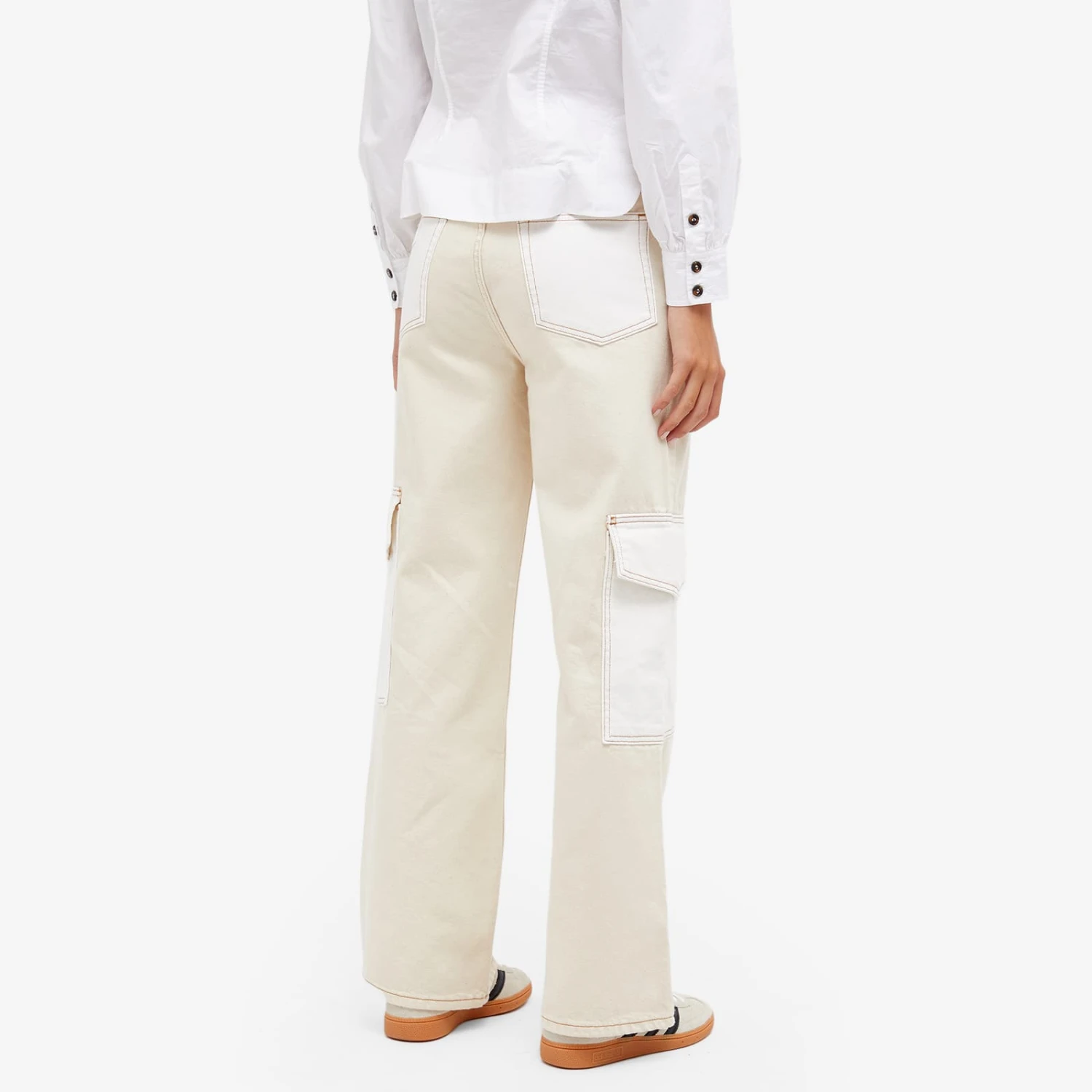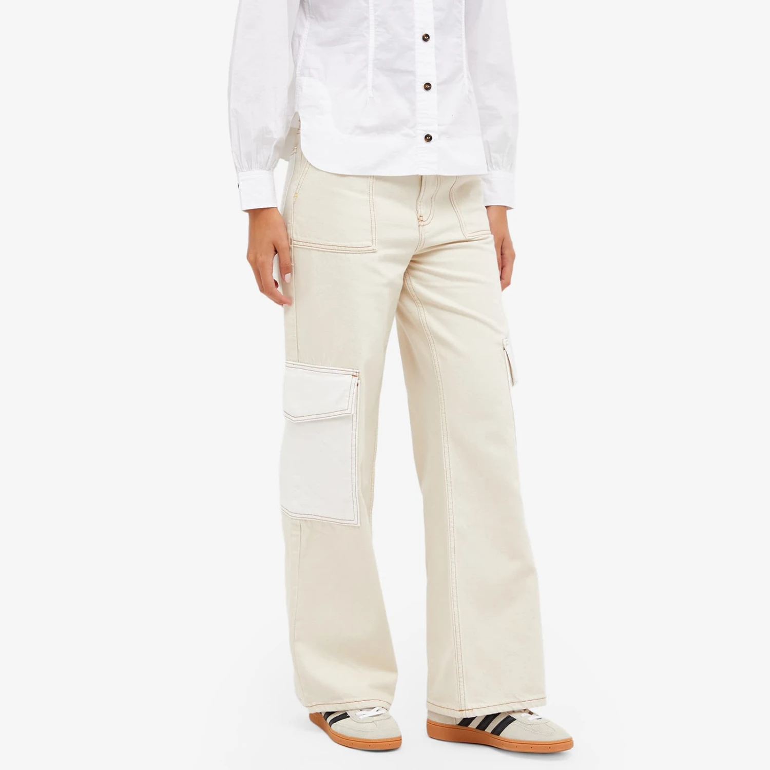 GANNI celebrates the Scandi minimalist movement of its hometown with these Ecru denim angi jeans. This neutral number embraces simplicity with an egret base and contrasting white pockets across the body – while gold-tone hardware and stitching punctuates subtly throughout.