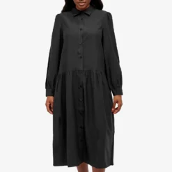 GANNI creates contemporary fashion with a Copenhagen-cool state of mind. We’re fan-girling over the Georgette Shirt Dress. It’s a fun spin on the classic little black dress, crafted from crinkle pleated fabric that’s floaty and light while sheer sleeves and gold-tone buttons draw the eye in.