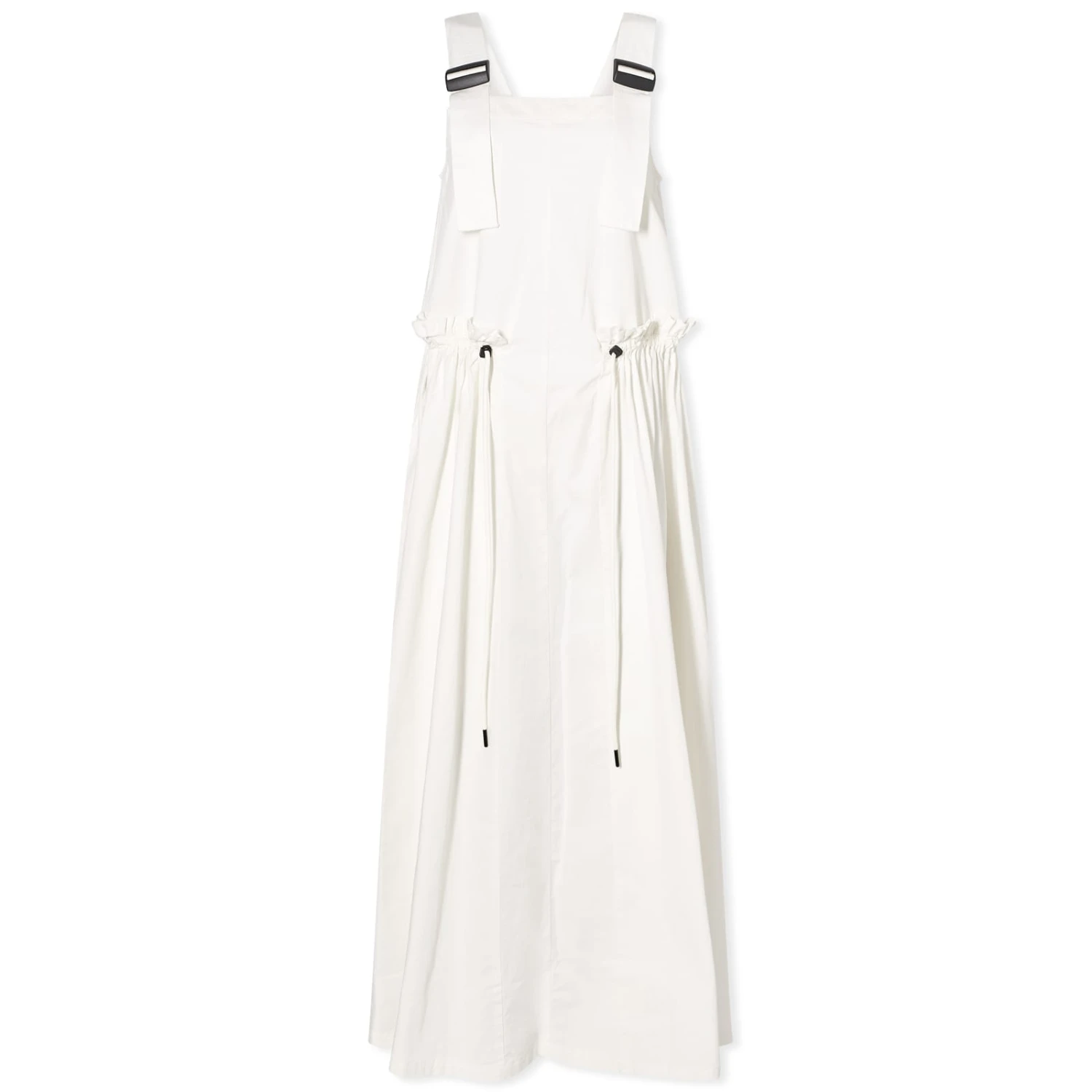Deriving influence from vintage workwear and military cuts, Girls of Dust present their take on a classic Sundress. Thick adjustable straps are accentuated with heavy buckles, contrasting against the delicate lettuce waist with an understated drawstring. It can be worn on its own or over a top as a truly unique layering piece.