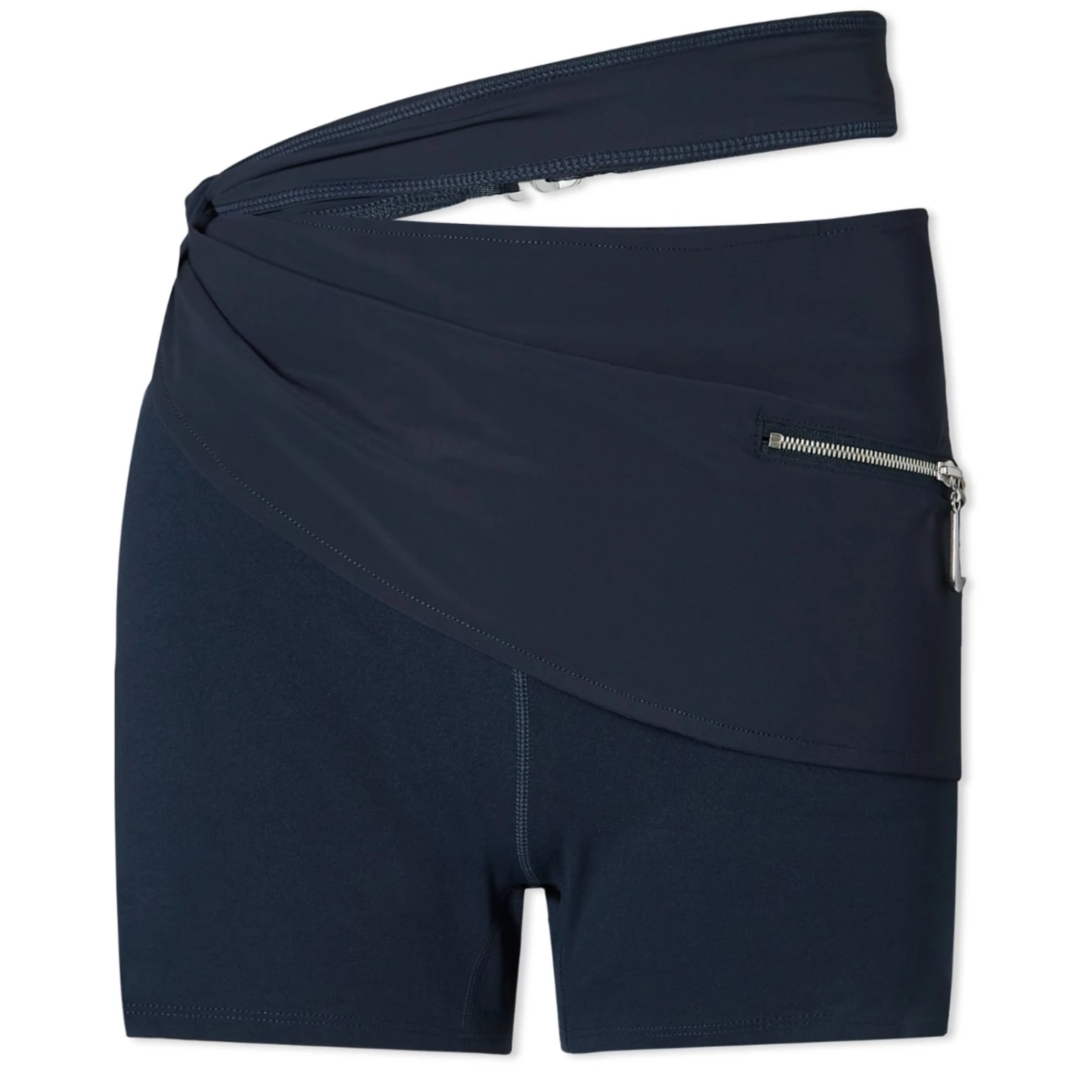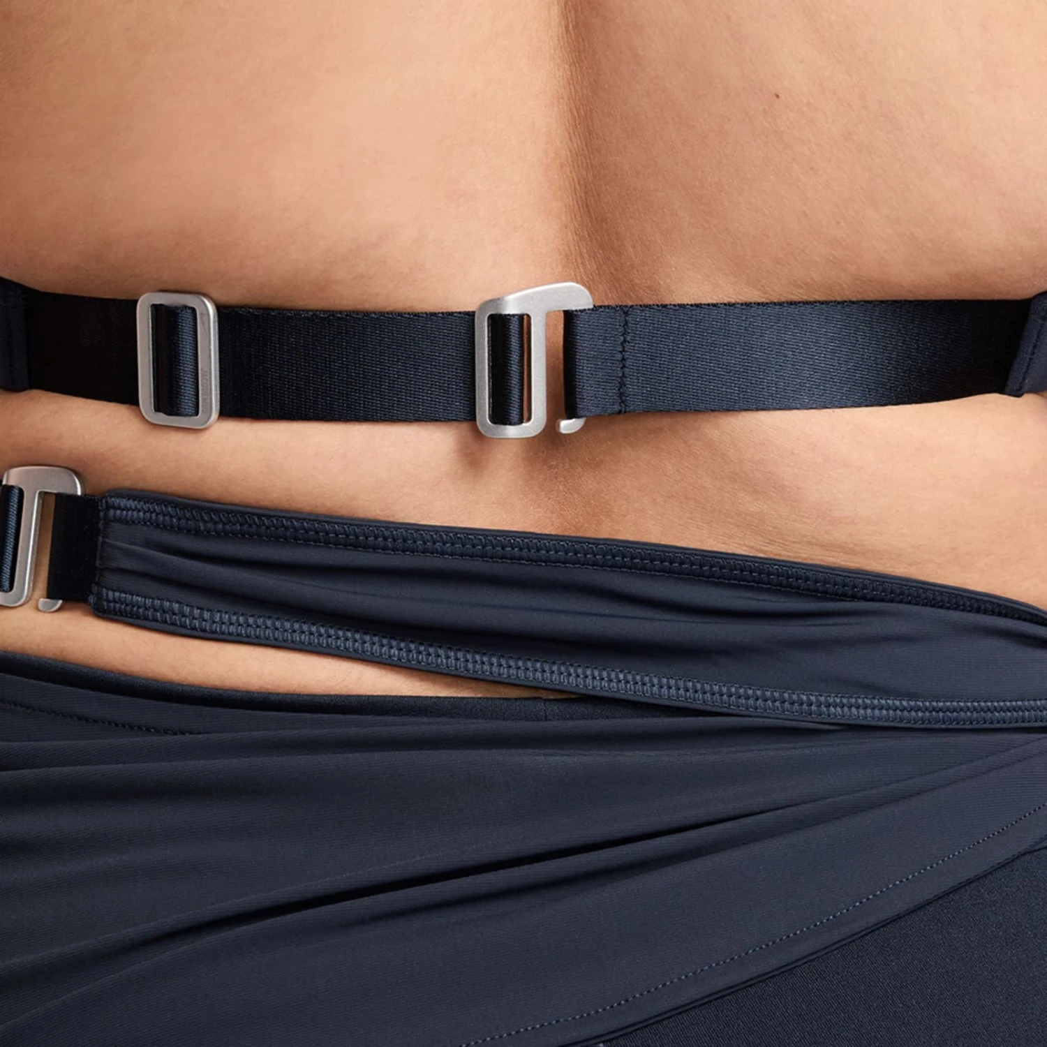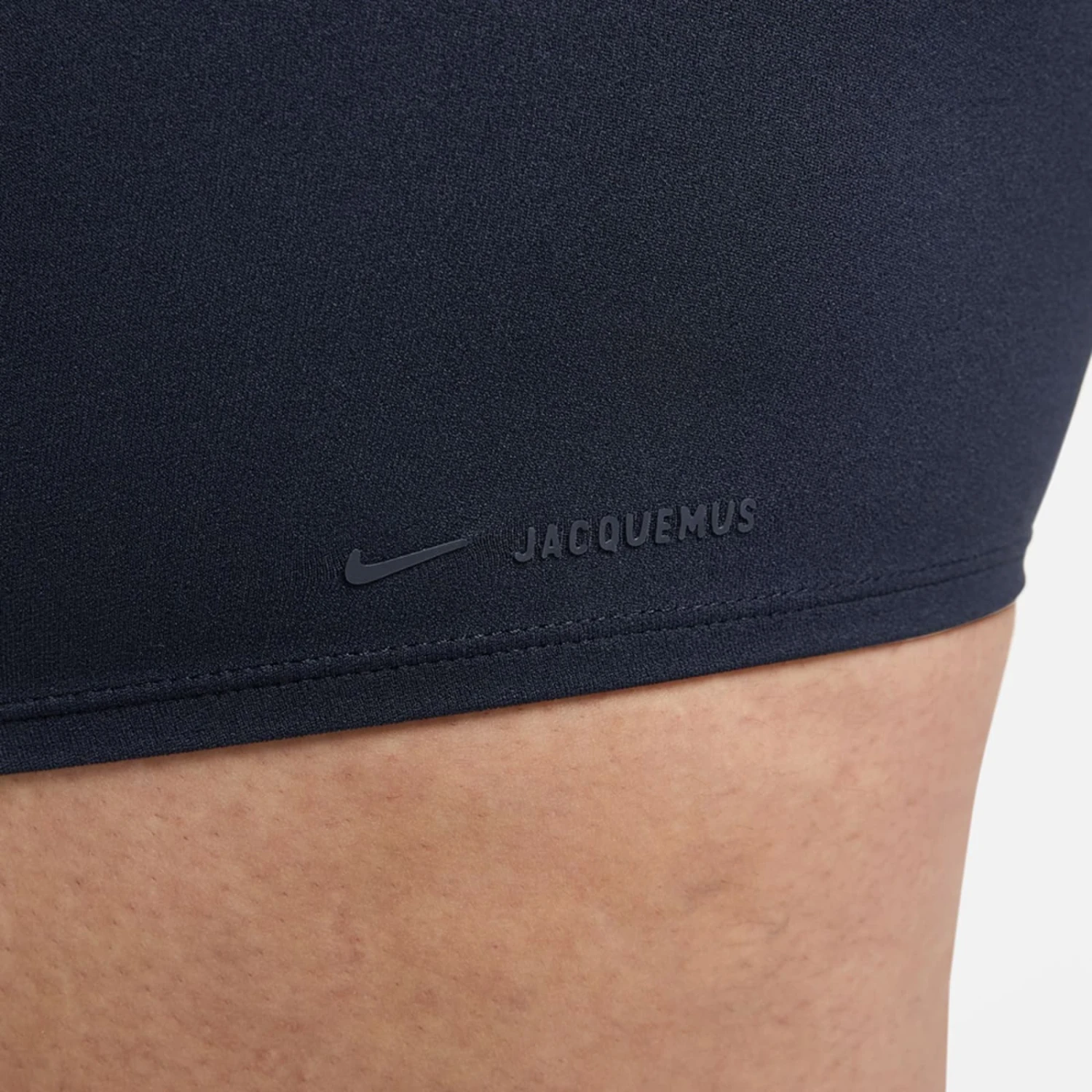 With summer around the corner, Nike X Jacquemus latest collaborative endeavour is here just in the nick of time. Crafted from a lightweight nylon blend, these layered shorts are fitted by design with a subtle golden zip on the front. Defined by asymmetrical detailing to partially wrap the waist, an adjustable, logo-engraved metal buckle completes the design.