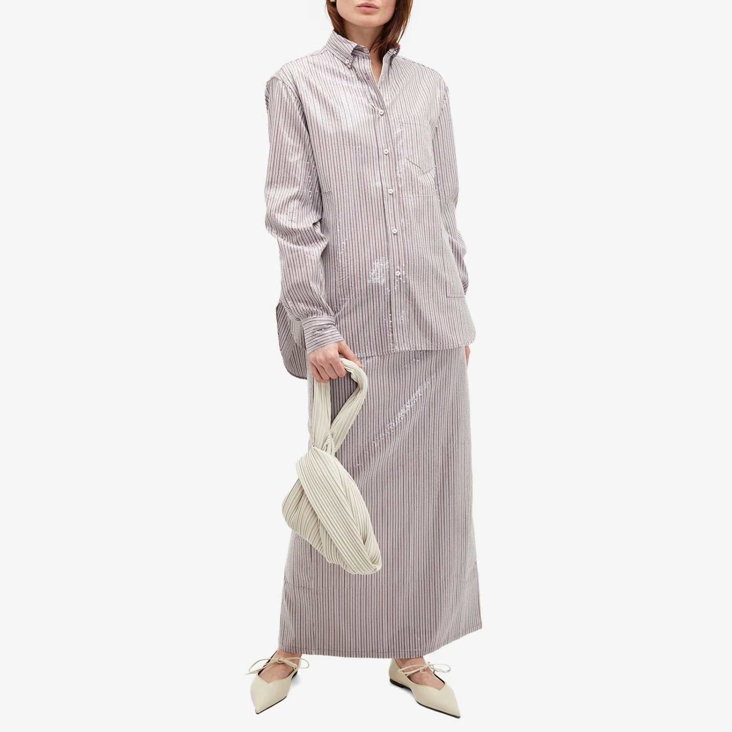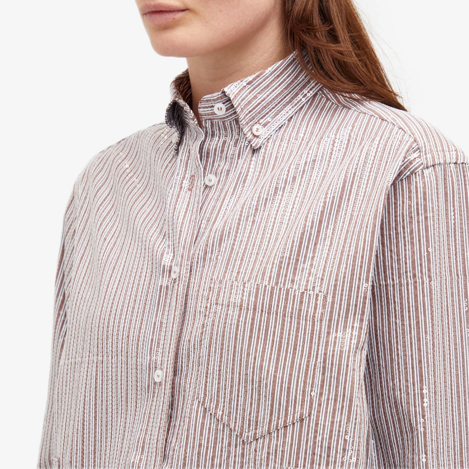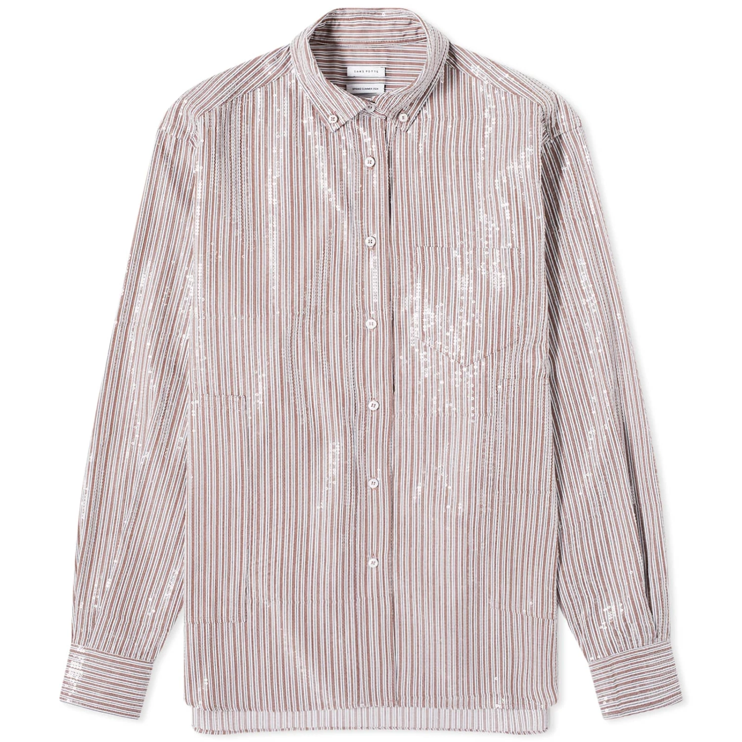 Saks Potts’ signature Copenhagen minimalism meets statement style with this Sequin Stripe Shirt. The label’s take on traditional male tailoring boasts a unique overlay of transparent sequins that allows a striped print to shine through, while creating an eye-catching shimmery effect that catches the light just right.