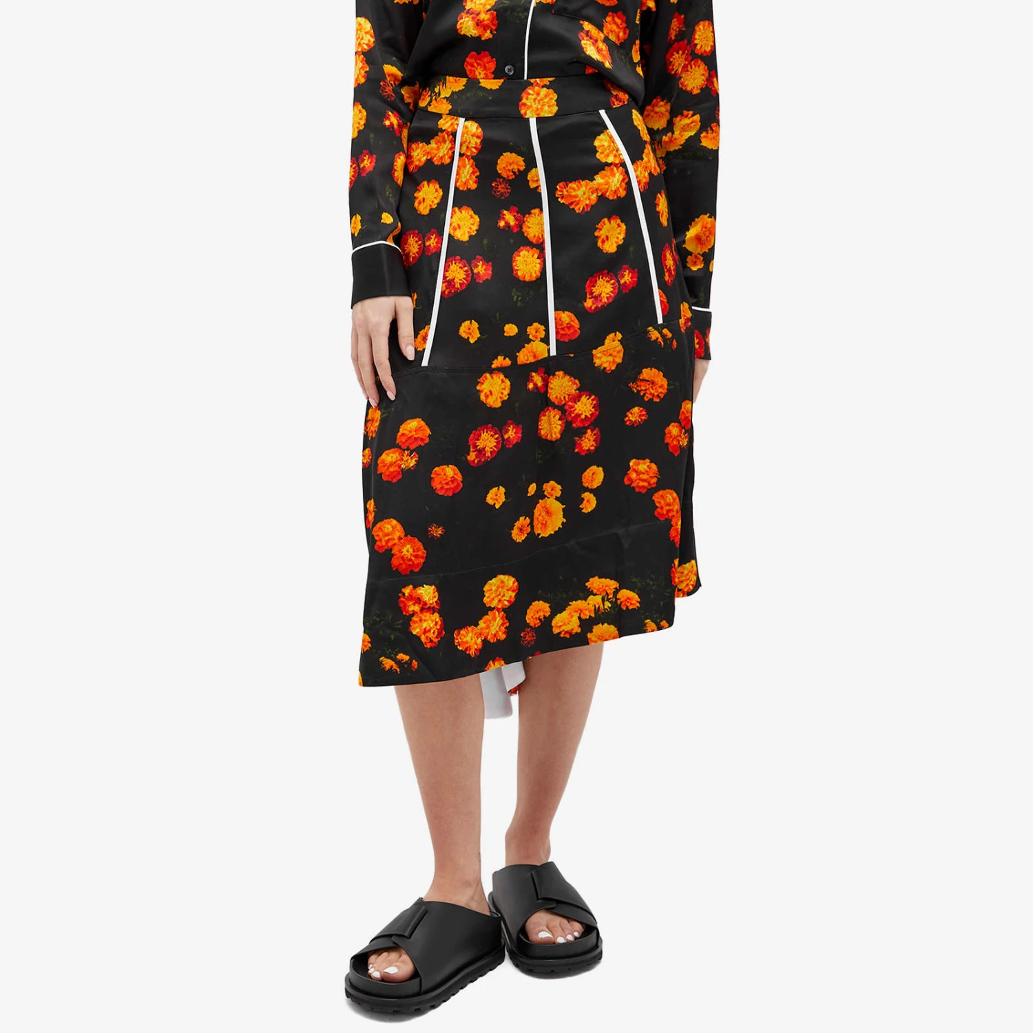Representing joy, bringing good luck, and even warding off evil spirits, the Marigold flower is beloved across many cultures. So, itβs no wonder that Wales Bonner β known for heritage and tradition infused designs – has referenced it with the print on the Hope skirt. With a flattering A-line silhouette and an asymmetrical hem which drapes longer at the back, it demonstrates a masterful control of shape and form. Contrast piping strikes down the front in contrasting white for a retro touch.