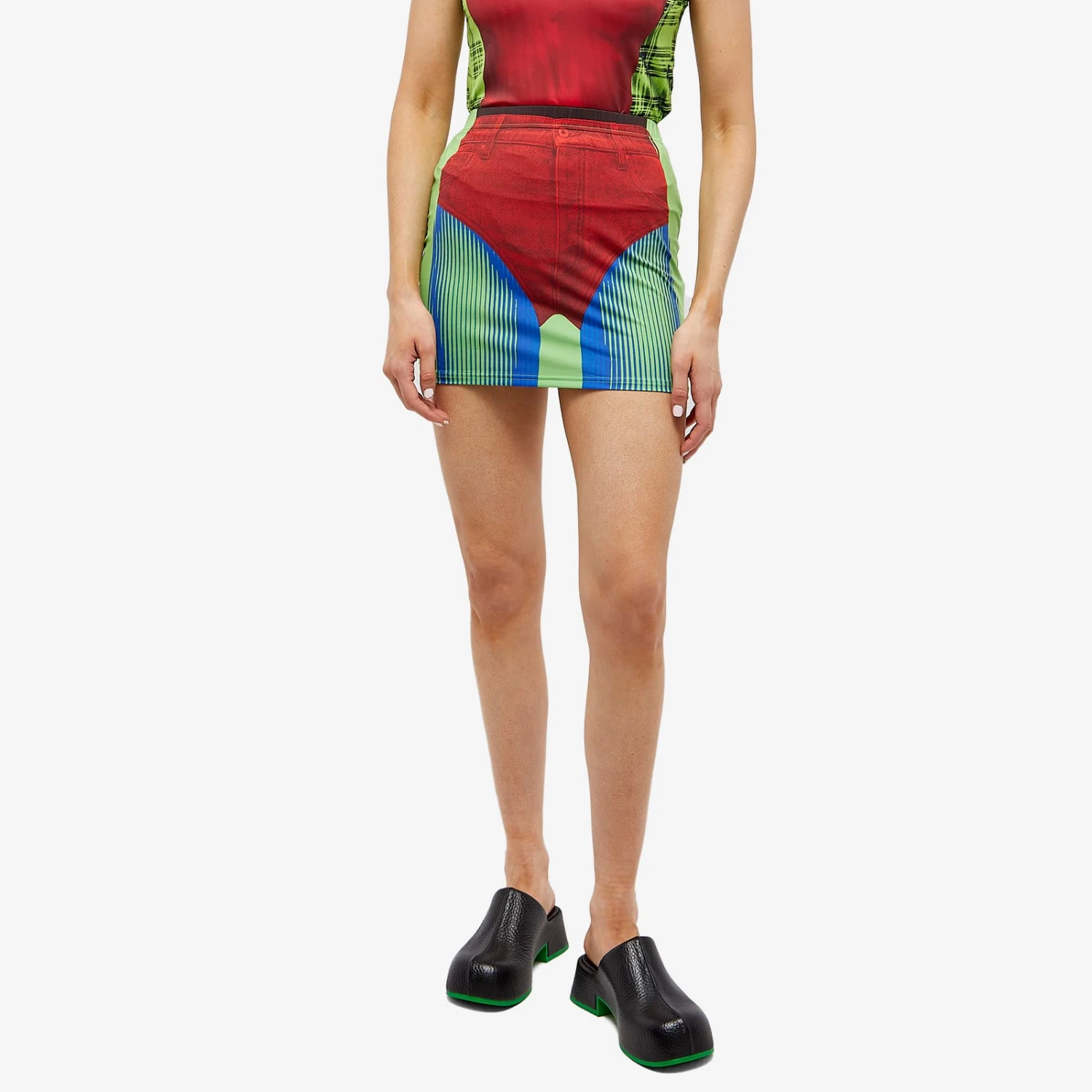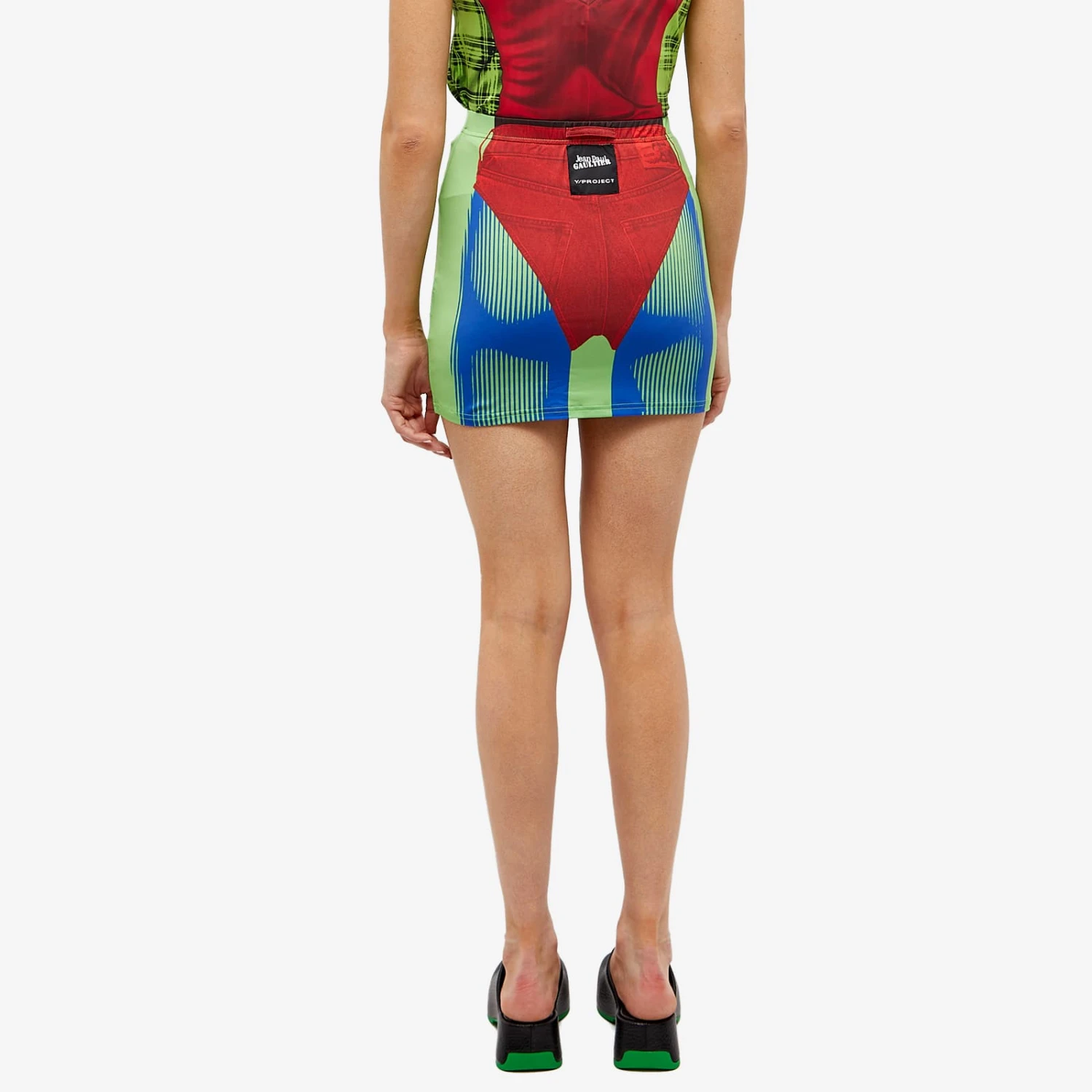 Y-Project is a Parisian-based brand that breaks all of the sartorial rules. Now collaborating with fashion legend Jean Paul Gaultier for a collection that merges the two worlds with aspects of trompe-l’oeil. Using Jean Paul Gaultier’s love for daring prints, this Janty mini skirt is printed to look like you’re wearing only a denim thong and hot blue leggings.